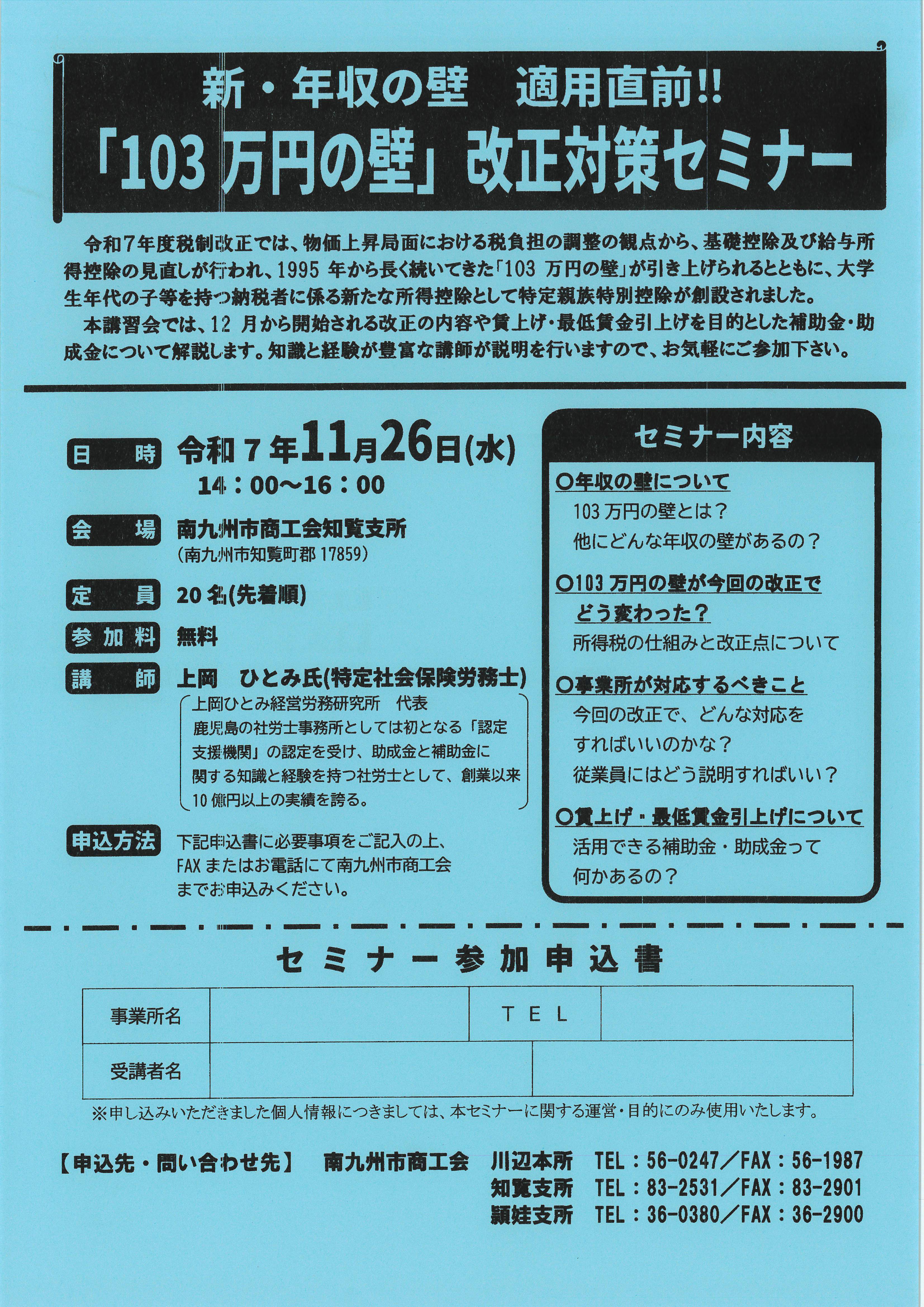 [南九州市商工会] 新・年収の壁 適用直前!! 「103万円の壁」改正対策セミナーのご案内