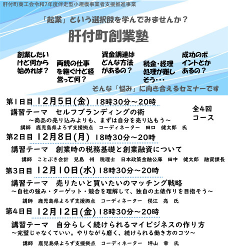 肝付町商工会では、令和7年12月5日(金)より、全4回のカリキュラムで創業セミナーを開催します!セミナーの講師には、(株)日本政策金融公庫鹿屋支店さま、鹿児島県よろず...