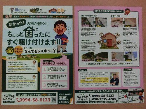 チラシのデザインを一新して、表記も、「何でもレスキュー」 から 【なんでもレスキュー】に変更しました。このデザインは、鹿児島市内にある、【 株式会社 アピール 】...