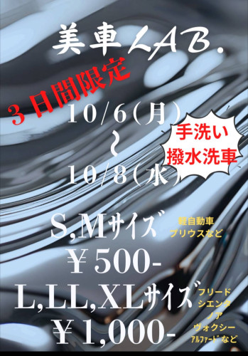 お疲れ様です😊今回、美車LAB. 5周年を迎えます😌皆様のお陰で5周年を迎える事が出来ました!!そこで、10月6日・7日・8日『3日間』手洗い撥水洗車をキャンペーン致しま...