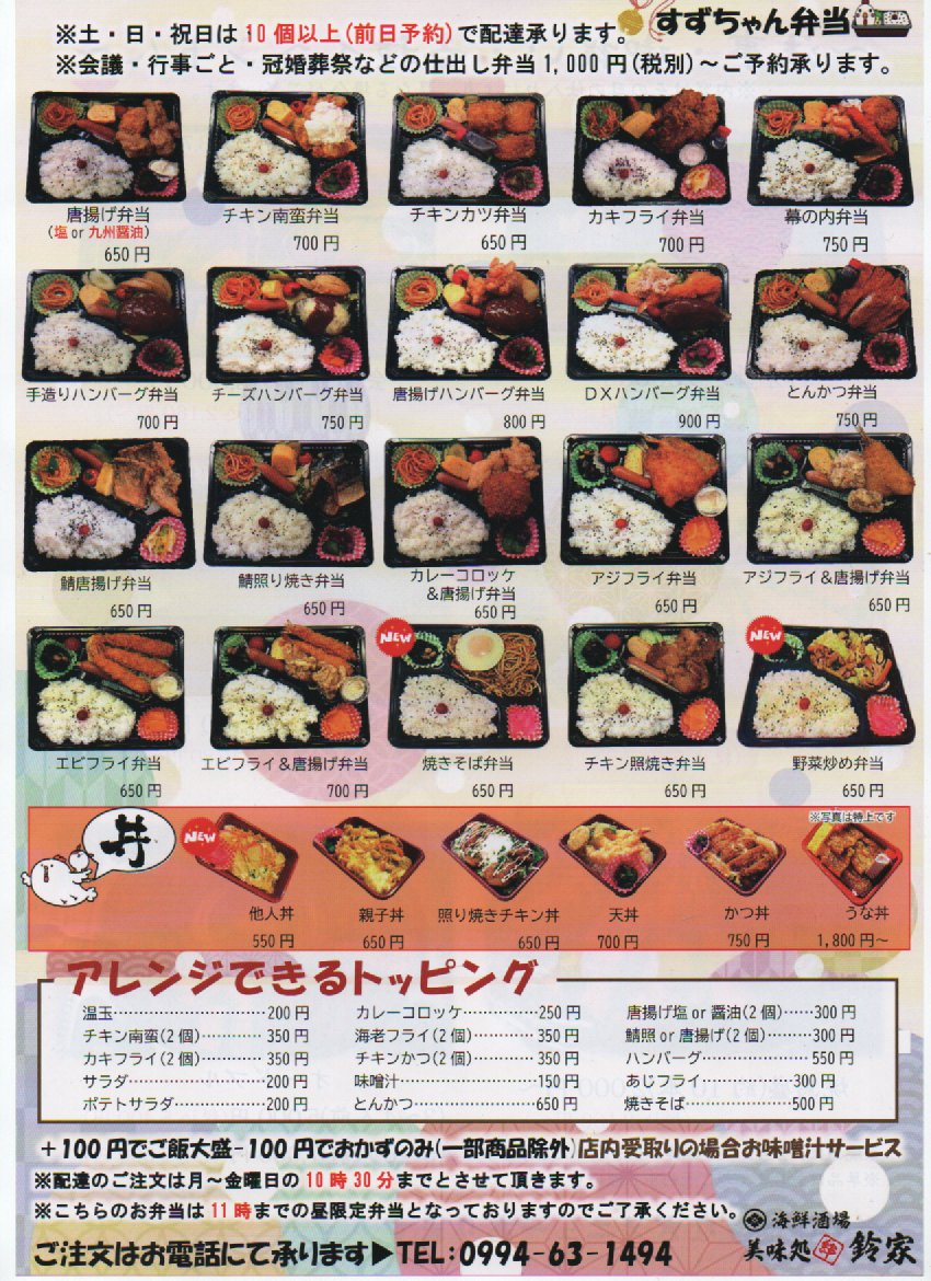 [ホテル一心館・海鮮居酒屋 美味処 鈴屋] すずちゃん弁当新メニュー