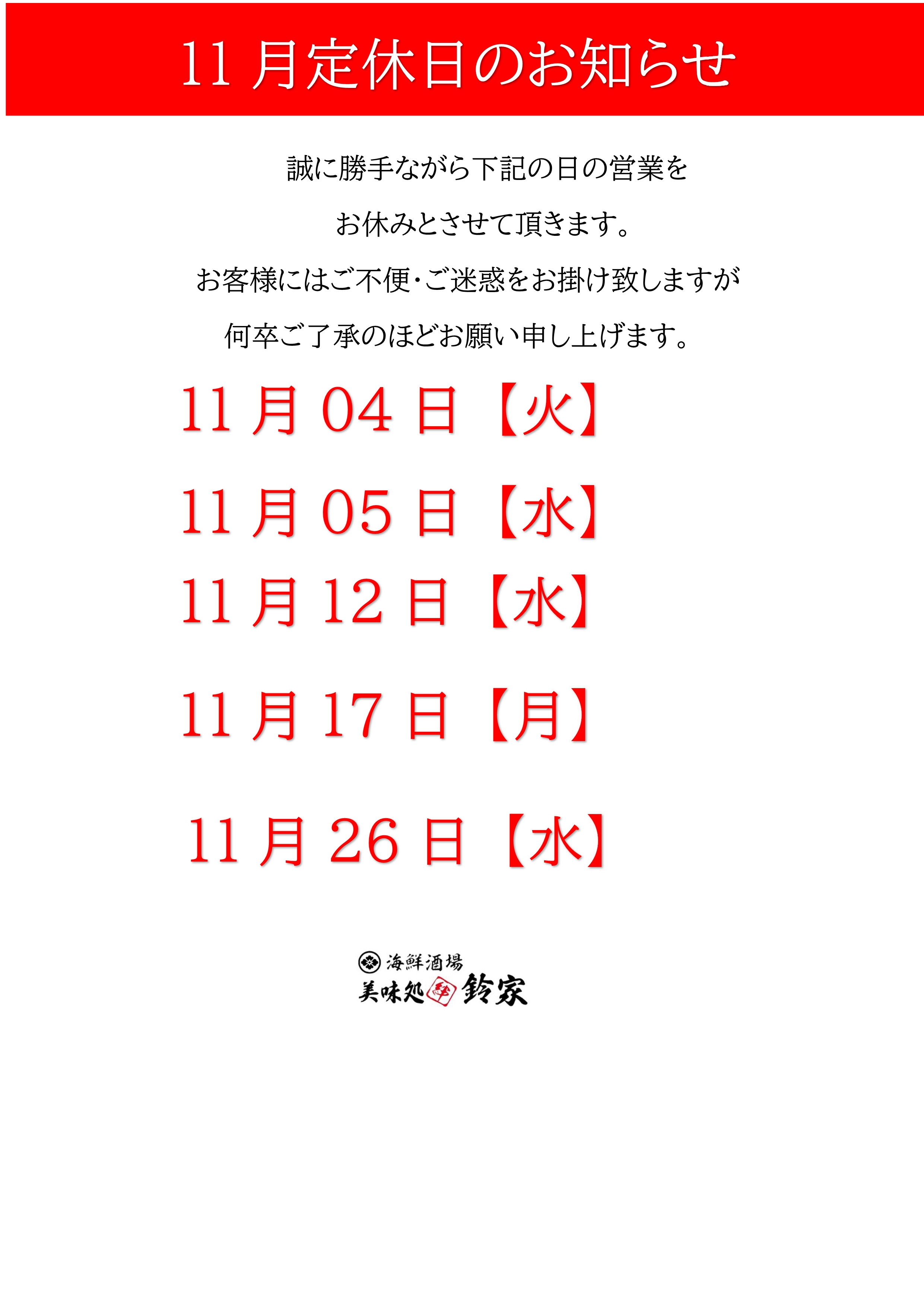 [ホテル一心館・海鮮居酒屋 美味処 鈴屋] 11月休み